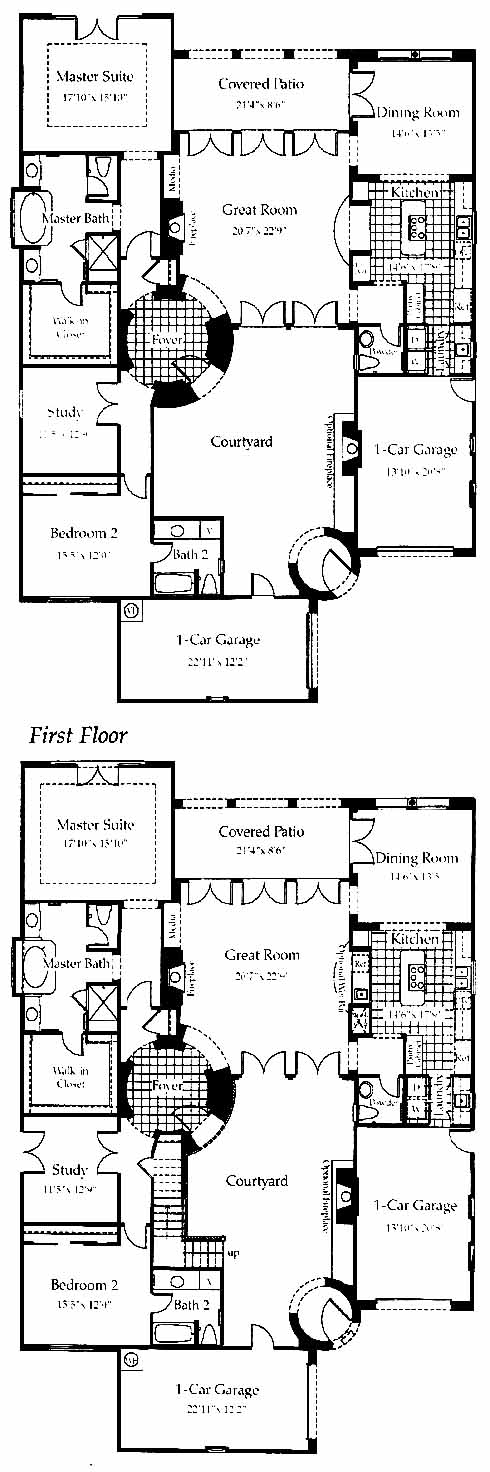 The elegant rotunda foyer greets you as you enter the home. Down the hall you'll find the 2nd bedroom with bath, study and master suite and bath with a walk-in closet. Next you'll come to the great room with fireplace which leads to the dining room and tiled kitchen with island.
