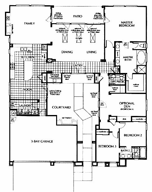 The large living and dining room greet you as you enter the home. To your left you'll find the family room and tiled kitchen with island and nook. On the other side of the home you have the 2nd and 3rd bedrooms with Jack and Jill bath, optional den and master bedroom and bath with dual vanities.