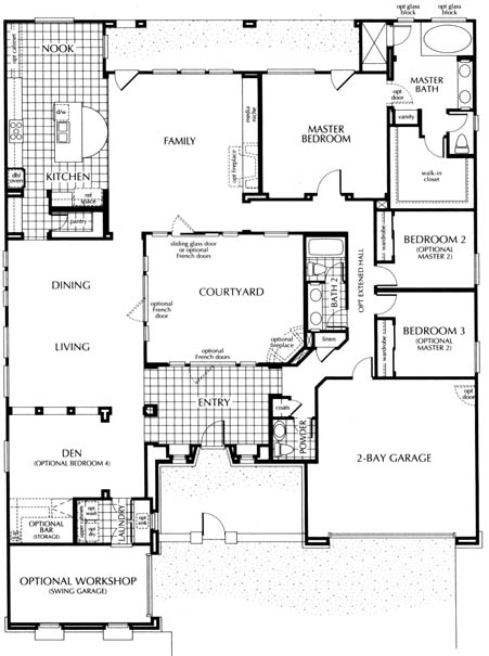 The large living and dining room greet you as you enter the home. To your left you'll find the family room and tiled kitchen with island and nook. On the other side of the home you have the 2nd and 3rd bedrooms with Jack and Jill bath, optional den and master bedroom and bath with dual vanities.