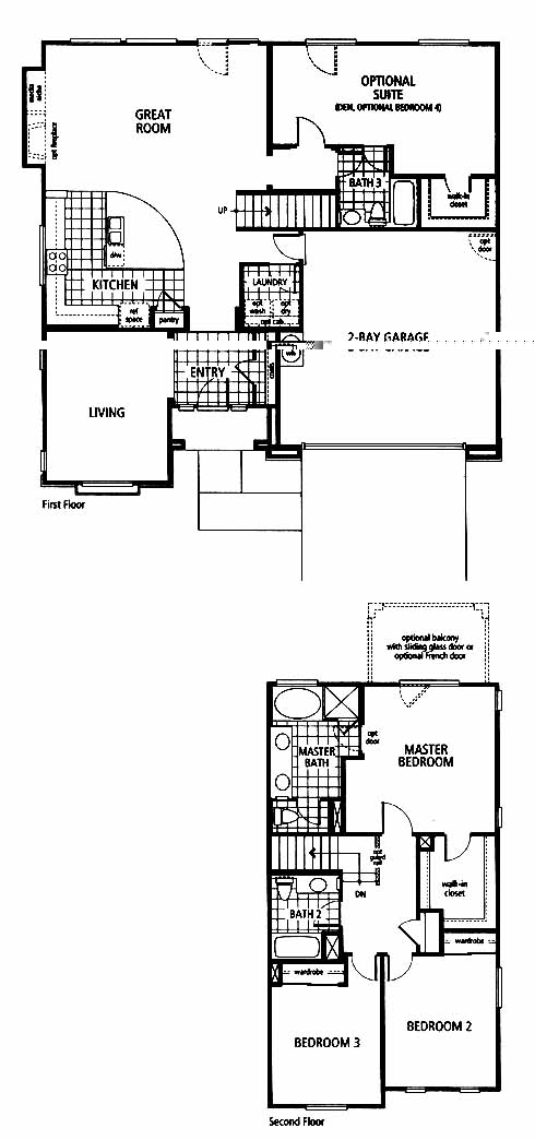 The entry takes you past the living room and into the great room with optional fireplace and media niche. From here you can access the tiled kitchen and optional suite with bath. Upstairs you have 2 bedrooms, hall bath and the master bedroom and bath with dual vanities.