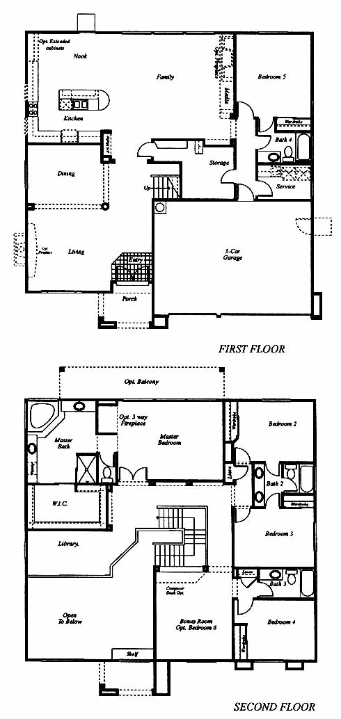 The tiled entry takes you past the living and dining room and into the family room with optional fireplace and media niche. From here you can access the 5th bedroom with bath and kitchen with island and nook. The second floor has the 2nd and 3rd bedrooms with Jack and Jill bath, 4th bedroom with bath, library, bonus room and the master bedroom and bath with dual vanities.