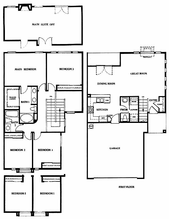This spacious home includes nine-foot high walls with vaulted ceilings, built in plant shelves and spacious walk-in closets. Enjoy a great room with a fireplace that adjoins the dining room. Upstairs you may choose an additional main suite with a built in fireplace. All closets come equipped with built in shelving. Unique pedestal sinks in the downstairs bathroom.