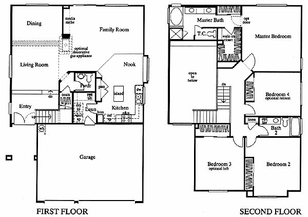 Unique floor plan with the upstairs open to below. The master bedroom has two walk-in closets, all bedrooms are upstairs. A huge kitchen with a nook, island and pantry. The family room has an optional three-way fireplace and a media niche. Optional master bedroom retreat or loft.