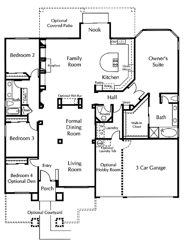 This stylish single story home features a spacious and open floor plan. The ceramic tiled entryway opens into a separate living room and formal dining room. The family room opens to the island kitchen. The large family room features a fireplace and an entertainment center niche. Sliding glass doors lead from the family room to the optional covered patio. Options include fireplaces, optional bedroom, den, or a courtyard.