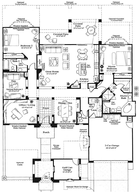 This exquisite single story executive home offers discriminating home buyers luxury living with elegant appointments and custom finishes throughout. Many customizing opportunities include, optional three car or golf cart garage, bedroom three, bay windows, sky lights, nook, den, home office, library, additional fireplaces, spa tub, covered patio, wet bar, and many other upgrades. On site architects and professional interior decorators are available to assist you in designing your home, and customizing your home to suit your individual tastes.