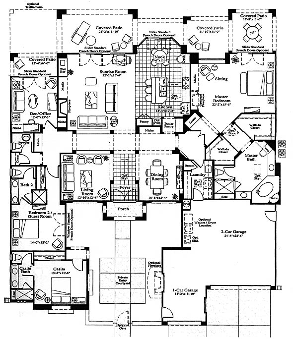 This exquisite single story executive home with sunrise room and private entry courtyard and casita with bath, offers discriminating home buyers luxury living with elegant appointments and custom finishes throughout. Many customizing opportunities include, optional three car or golf cart garage, extended sunrise room, bedroom three, bay windows, sky lights, nook, den, home office, library, additional fireplaces, spa tub, covered patio, wet bar, and many other upgrades. On site architects and professional interior decorators are available to assist you in designing your home, and customizing your home to suit your individual tastes.
