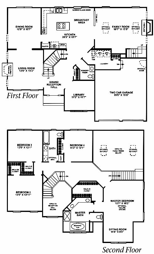 The grand reception hall flanked by the living room and library takes you into the kitchen with island and breakfast area. From here you can access the dining room and the massive family room with fireplace and optional skylights. Upstairs you'll find 3 spacious bedrooms, hall bath and the impressive master bedroom with sitting room and master bath with walk-in closet.