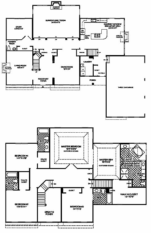 The two story foyer flanked by the lovely living and dining room takes you into the sunken family room with standard fireplace. To your left you'll find the study, and to your right you have the gourmet kitchen with island and breakfast area with optional fireplace. On the second floor you'll find 3 spacious bedrooms, each with their own bathroom and the massive master bedroom with master den, walk-in closet and master bath with dual vanities.