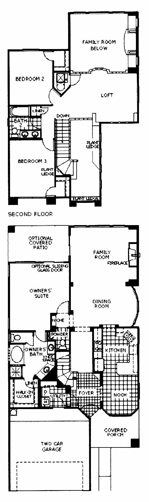 Tiled foyer, kitchen, nook, utility room, powder room, and upstairs bathroom. Owner's suite on the main floor with large master bath and walk-in closet. Family room with fireplace. Upstairs, there is a loft, and an open space above the family room, plus the other two bedrooms.