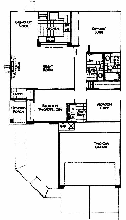 This single story home is the contemporary southwest elevation of this plan. This home is inviting from the outside in. A covered porch leads into a Great room, with fireplace option, adjoins to breakfast nook. The open kitchen overlooks the Great room. Nice Owner's suite with wall to wall closet and connecting full bath. Bedroom 2 can also option as a Den off the Great room. Nice functional plan.