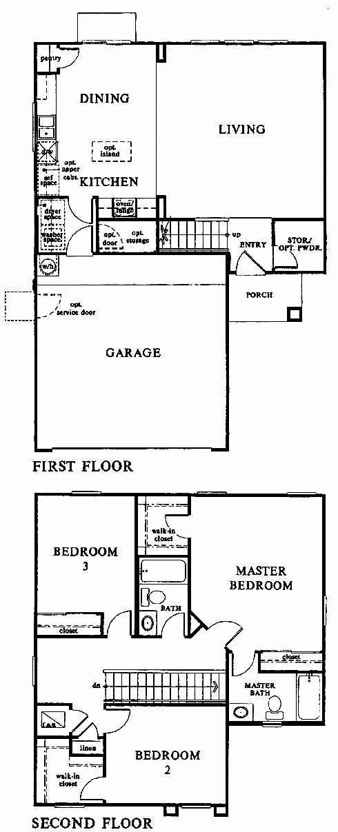 Two-story plan with the living kitchen and dining rooms on the main floor. Upstairs, there is a large master bedroom and the other two bedrooms