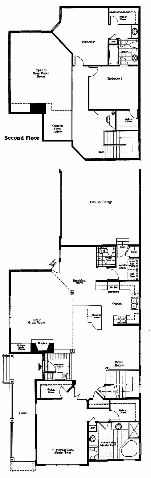 The two-story foyer takes you directly into the dining room of this lovely home. To your right you'll find the master suite with his and her walk-in closets and the master bath with dual vanities. To your left you can access the great room with fireplace and optional media center and the large kitchen with island and breakfast nook. Upstairs you'll find the 2nd and 3rd bedrooms with Jack and Jill bath.
