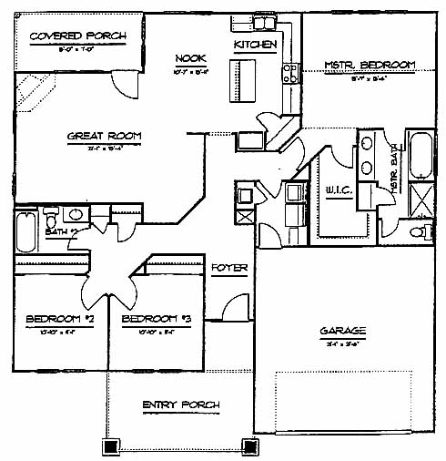 This cottage home features a spacious great room with optional fireplace plus access to the covered porch outside. The nook area leads to the kitchen with pantry and island workspace. The master bedroom includes a large walk-in closet and master bath with double vanity, tub and separate shower. Two more bedrooms at the front of the home share a bath.