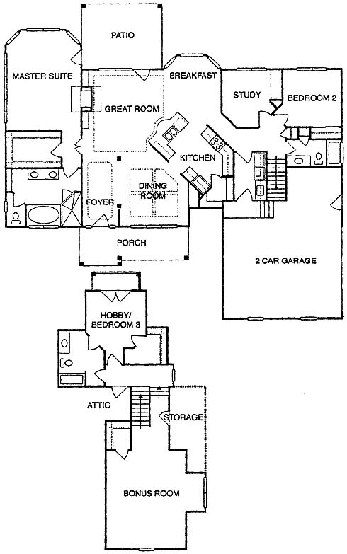 This home features a large master suite to one side of the home that includes a walk-in closet, private bath, access to the patio and views of the two-way fireplace. On the opposite side of the fireplace is the great room, perfect for entertaining guests and also has access to the patio. The kitchen includes a walk-in pantry and leads to the dining room and breakfast area on either side. The study makes a nice home office. A second bedroom is located in the back corner of the home and is close to a bath and the laundry room. The third bedroom makes a nice guest suite with its walk-in closet and private bath. This bedroom and a bonus room make up the second floor of this gorgeous home.