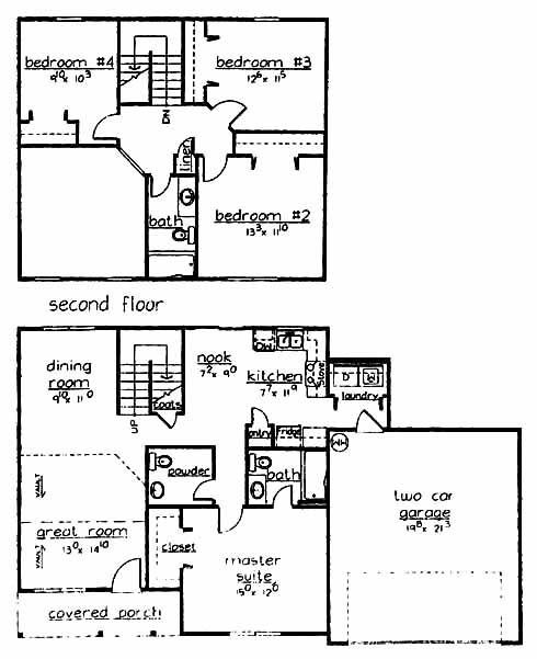 This two-story home includes a first-floor master suite with private bath and walk-in closet. The great room has a vaulted ceiling and leads to the dining room in the back. The kitchen has a pantry and opens into the nook area. The second floor has three more bedrooms that share a bath.