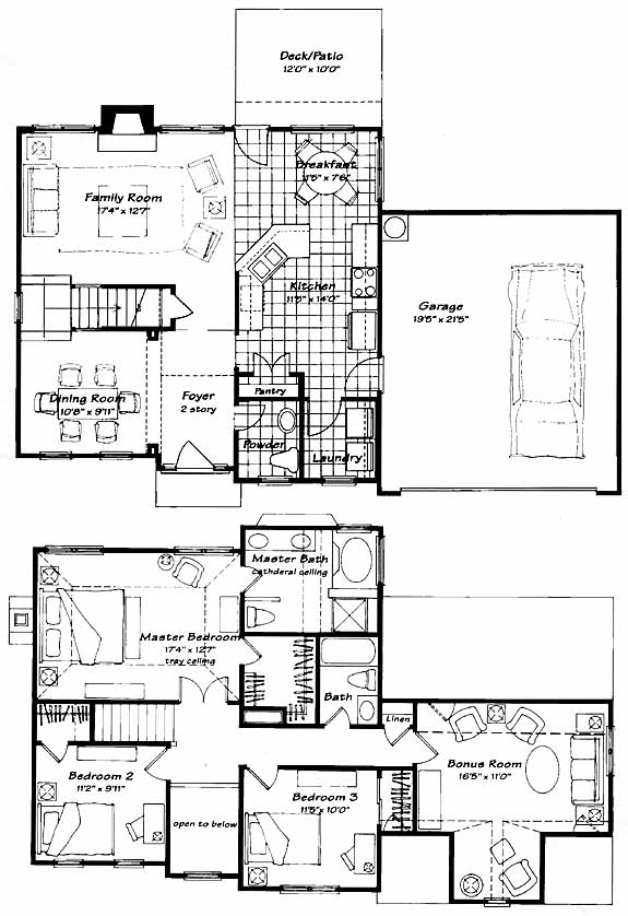 A gracious two-story foyer welcomes guests to the formal dining room and leads them to the sunlit family room. The well designed kitchen has a large breakfast bar and sunny eating nook and has a pantry large enough to store more than just food. Upstairs luxury begins as you open the double doors to your master suite featuring a bedroom with tray ceiling, abundant windows and a walk-in closet. A bonus room and two other bedrooms are also upstairs.