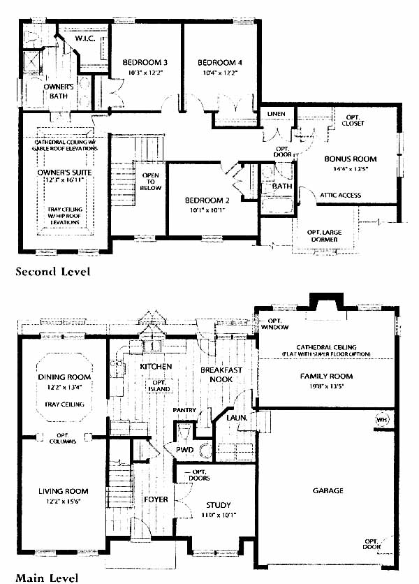 The tiled foyer flanked by the study and living room leads you past the powder room and into the tiled kitchen with island, pantry and breakfast nook. From the kitchen you can access the dining room with tray ceiling and the huge family room with fireplace and cathedral ceiling. Upstairs you'll find the 2nd and 3rd bedrooms, 4th bedroom with bath, spacious bonus room, hall bath and the owner's suite and bath with walk-in closet, dual vanities, tub and shower.