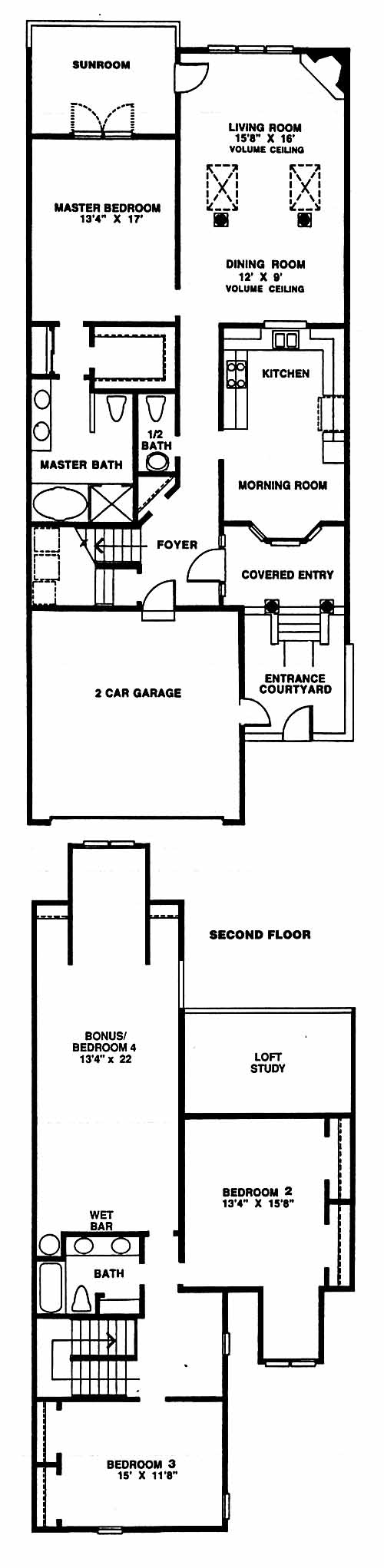 This home favors the owner's comfort with large first floor master suite and whirlpool tub. Living area is sunlit with volume ceiling. A large covered entry with the courtyard offers a welcome to your uniquely styled home.