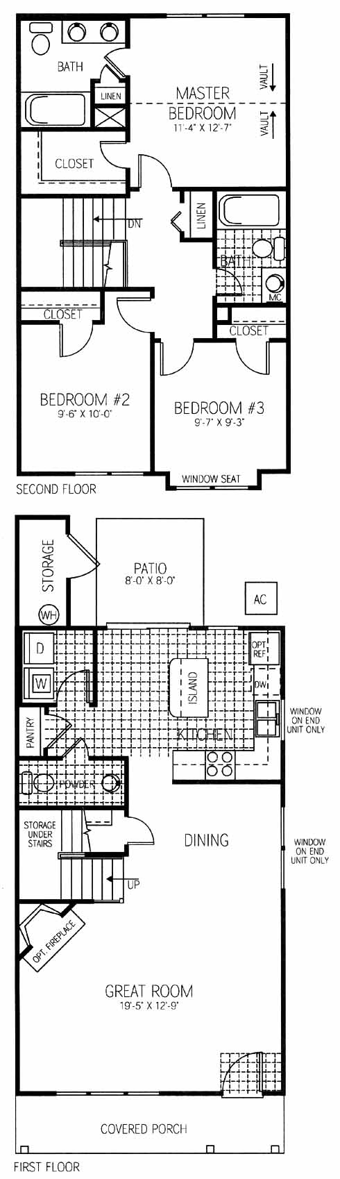 This townhome has a large great room at the entrance that leads to the dining room. The kitchen has an island workspace, pantry and access to the patio outside. The second-floor master suite includes a private bath with double vanity and a walk-in closet. Two more bedrooms share a bath.
