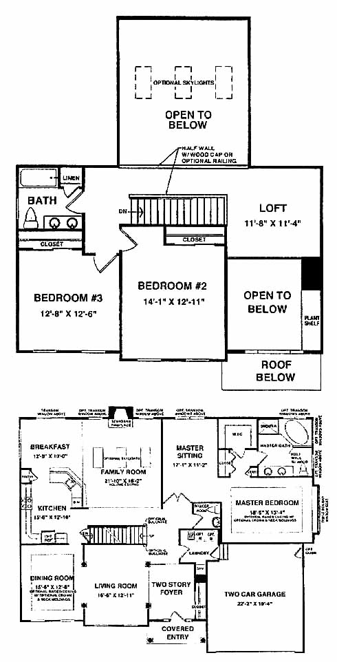 This home has a dramatic two-story foyer with living room to one side. The dining room has an optional tray ceiling that leads to the kitchen with ample counterspace. The breakfast opens into the family room with fireplace and optional skylights. The master suite includes a private sitting area, walk-in closet and master bath with soaking tub and separate shower. The second floor has two more bedrooms, a bath and a loft area with views of the foyer and family room below.
