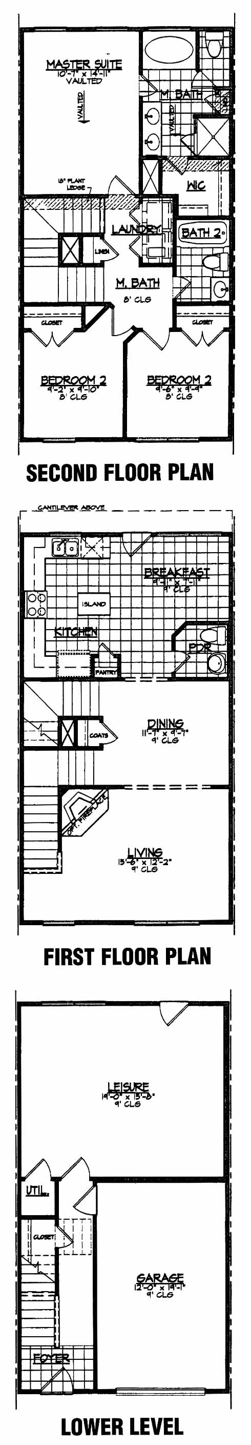 This three-level townhome has a one-car garage and leisure room on the bottom floor. The first floor has a large living room at the front that is perfect for entertaining guests. The dining room leads to the kitchen with pantry, island workspace and breakfast area. The second floor has three bedrooms, including the master suite with vaulted ceiling, walk-in closet and private bath.