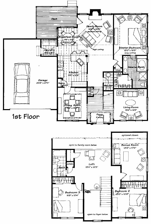 This home has a vaulted ceiling in the great room that opens to the loft above. The living room is perfect for quiet moments and the dining room is designed for both formal and informal dining. The first floor master suite has a tray ceiling and a luxury bath with a double vanity, garden tub and a walk-in closet. Two bedrooms, a loft, and a bonus room are on the second floor. The loft is a wonderful size for a study area, sitting room or a game area.