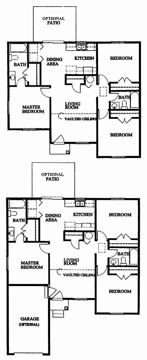 This home features a living room with vaulted ceiling at the entrance. The kitchen in the back has ample workspace for preparing meals and opens into the dining room with access to optional patio outside. The master suite has a walk-in closet and private bath. Two more bedrooms have ample closet space and share a bath between them.