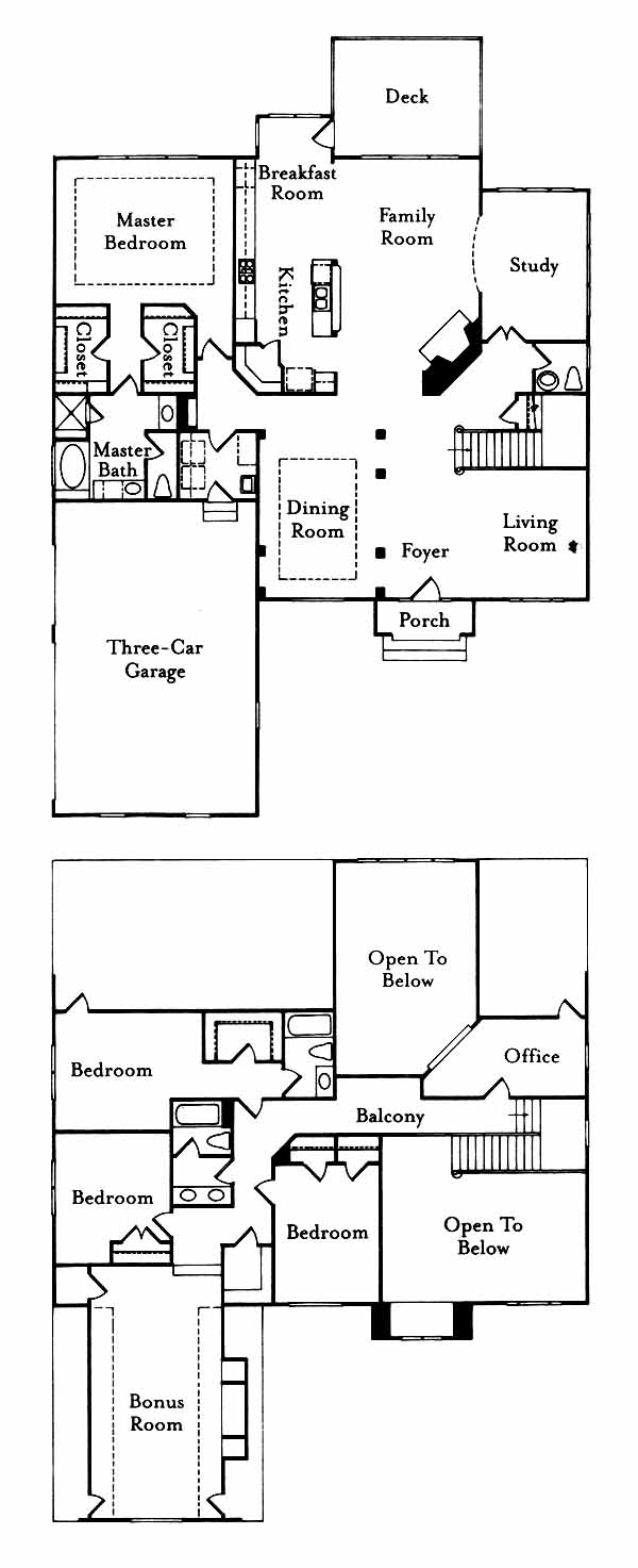 A two-story foyer introduces this stunning brick home. The foyer opens on either side to formal living and dining rooms, creating an ideal space for entertaining. Columns and tray ceiling enhance the elegance of the dining room, while soaring elevations add drama to the living room. The study with its numerous windows, offers a pleasant place for reading or conversation. One wall in the family room is given over to a two-story, arched window design. In addition this room offers a corner fireplace and a media niche. The kitchen shares an open space with the breakfast room, making it easy to serve casual meals. The breakfast room enjoys a box bay area with a French door opening to the home's back deck. The convenient, main level Master Suite has a coffered ceiling and his and her walk-in closets. The luxurious master bath boasts a large oval tub and dual vanities. The upper level has one bedroom with a private bath, while two additional bedrooms share a convenient bath with dual vanities. The bonus room provides space for children to play. The office, located in a quiet corner of the house, is a perfect place to work or complete household tasks.