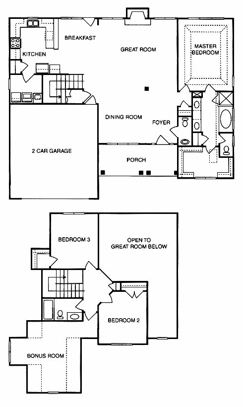This two-story home has a nice front porch that leads to the foyer with dining room to one side. The great room with fireplace is a nice spot for entertaining guests. The breakfast area to one side leads to the kitchen with pantry, ample counterspace and opens into the laundry room. The first-floor master suite includes an oversized walk-in closet and private bath with double vanity, tub and separate shower. The second floor has two more bedrooms, a bath and a bonus room that makes a nice fitness room.
