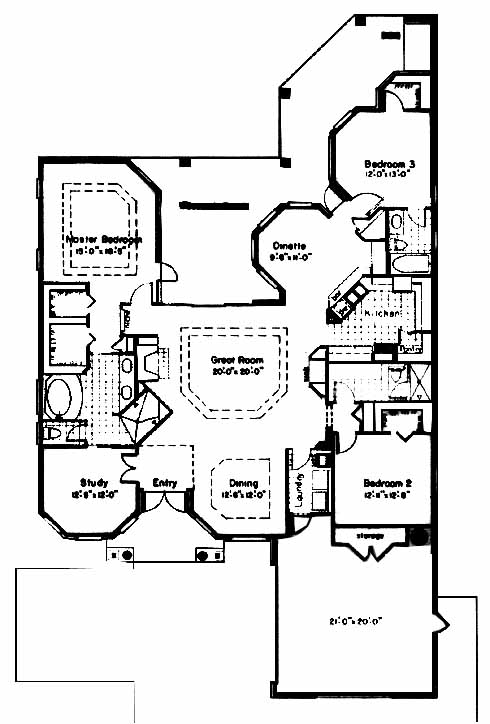The entry flanked by the study and dining room takes you into the great room with fireplace. To your left you'll find the master bedroom and bath with his and her walk-in closets. On the other side of the home you'll find the 2nd and 3rd bedrooms and the tiled kitchen with dinette area.