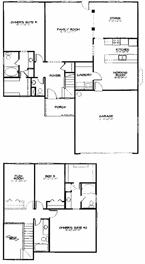 The Valdosta features two Owners Suites, one upstairs and one downstairs, each with its own master bathroom and spacious walk-in closet. Downstairs there is an additional half bath for guests. The family room and dining room offer flexibility as to how separate they are and there is a nice Morning Room off of the kitchen which features a GE appliance package that includes 'White on White' self-cleaning smooth top range, refrigerator and freezer with icemaker, dishwasher and garbage disposal. Your choice of quality, 38 ounce plush carpeting with Scotch guard comes installed in the living room and bedrooms. Armstrong Initiator vinyl is featured in the kitchen and baths. The second floor has a large Flex Space and the oversized second Owners Suite, along with the third bedroom and third full bathroom. This is a great family home. This home features a dual controlled HVAC system.