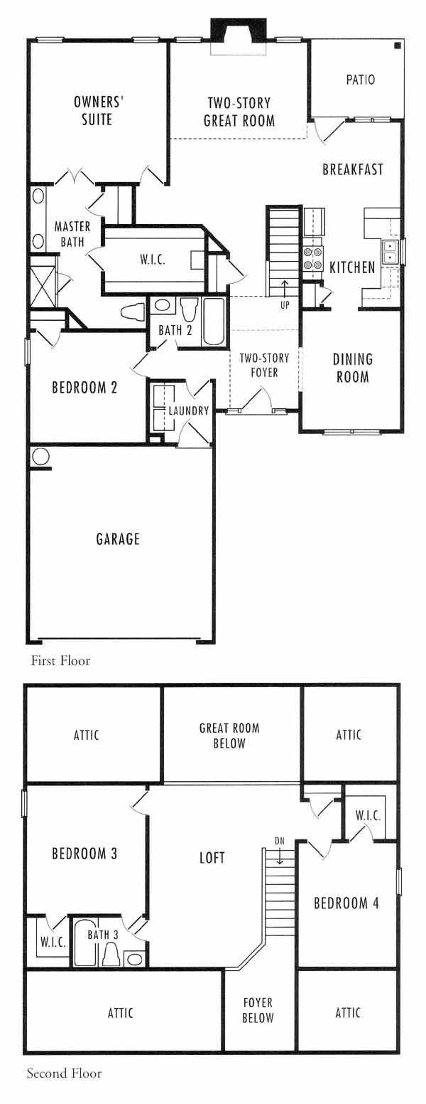 The 2 story foyer leads you into this impressive home. You will immediately pass the dining room and the 2nd bedroom with hall bath just before you come to the 2 story great room. To your left is the owner's suite and master bath with dual vanities and walk-in closet. Next is the kitchen with pantry and breakfast nook which access's the patio. On the second floor you have the 3rd bedroom with walk-in closet and bathroom, 4th bedroom with walk-in closet and a large loft.