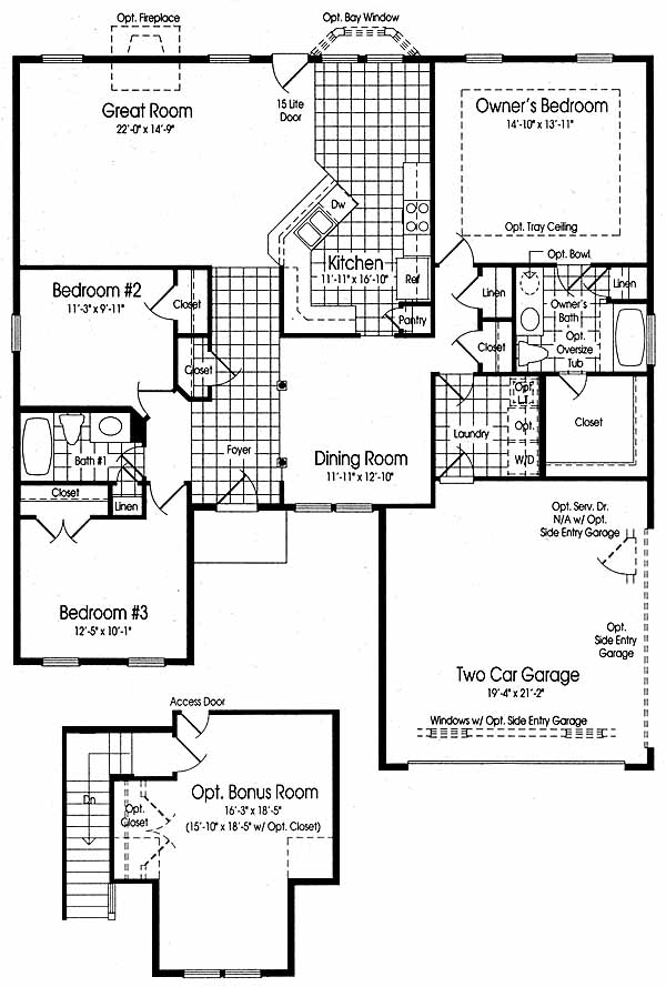 Split bedroom ranch style home with dining room and great room with optional fireplace. Other options included in the price of this home is a side load garage and bonus room which is located over the dining area.