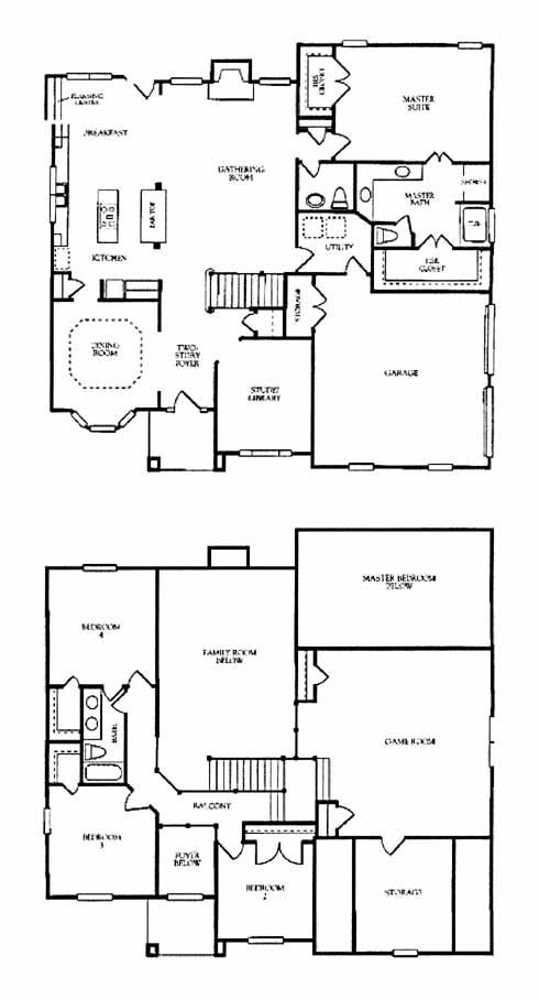 This home has a dramatic two-story foyer with a dining room and study on either side. The gathering room at the back includes a fireplace and is perfect for entertaining guests. The kitchen has an island range, pantry and bar top that leads to the breakfast area. The first-floor master suite includes his and her walk-in closets, and a private bath with tub and separate shower. The second floor has three bedrooms with ample closet space and a game room. Views of the family room below can be seen from the balcony.