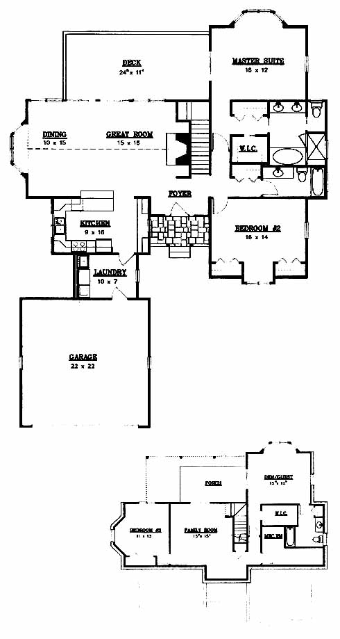 This manor home includes a spacious kitchen with ample counter space for preparing meals to one side of the foyer entrance. The great room with fireplace leads to the dining room with bay window. Access the deck from both the dining and great room. The first-floor master suite includes a bay window, private access to the deck, a walk-in closet and master bath with double vanity, tub and separate shower. A second bedroom is located at the front of the home. Two more bedrooms are located on the second floor, along with a spacious family room.
