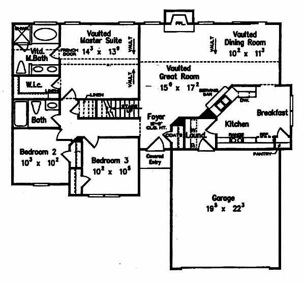 This is a great ranch plan with an optional second floor bonus room. It features an open foyer with a large great room and vaulted ceilings. Large kitchen that overlooks the greatroom. Vaulted ceilings in the master bedroom, French doors open to the master bath with a dual vanity, separate shower and a large garden tub.