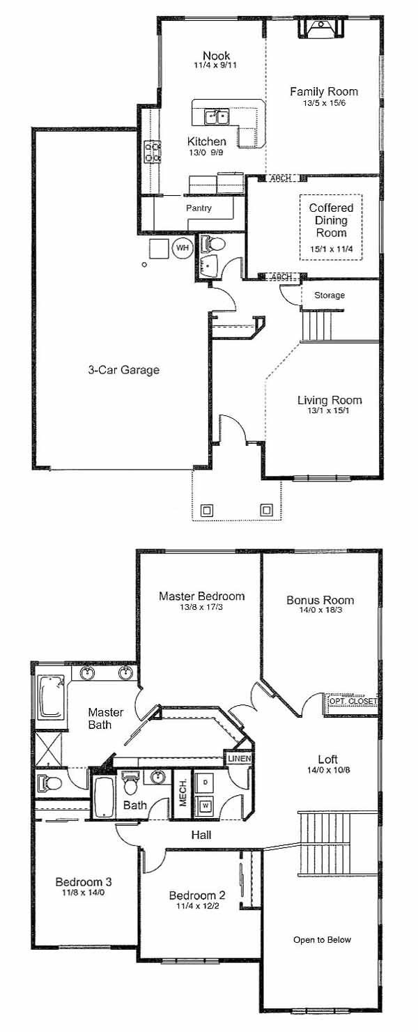 As you enter the home you're immediately greeted by the living room on your right. As you continue down the hall you'll pass the powder room, step under the arches and come to the lovely dining room with coffered ceiling. Next is the large family room with fireplace which access's the large kitchen with pantry and breakfast nook. Upstairs you'll find the 2nd and 3rd bedrooms, hall bath, loft and the impressive master bedroom and bath with walk-in closet and dual vanities.