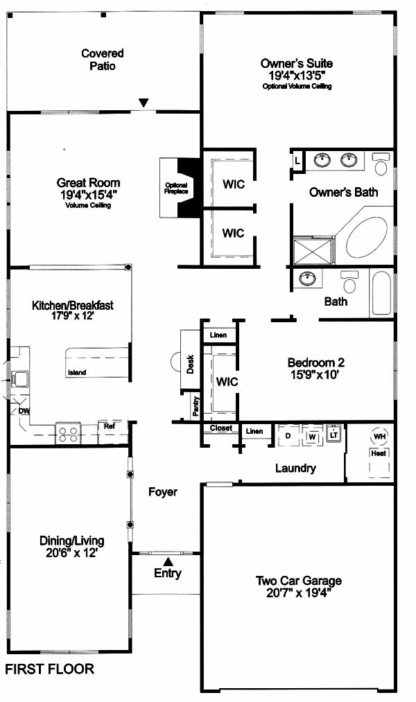 This home takes the 'first floor living' concept to the next level with two bedrooms and an optional third, each with its own bath! Design your own home with optional sun room, slab or basement and three choices of second floor layouts (loft with bedroom and bath, loft and storage areas, or entirely storage) you decide. From the two car garage you have a stepless entry into the island counter kitchen. Warm up by the fire in the family room then adjourn to the master suite and the luxurious raised tub.