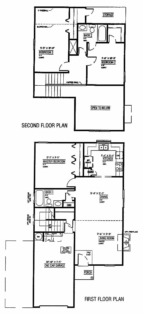 This two-story home has a spacious living room at the entrance that has a vaulted ceiling and an optional fireplace. Next is the dining room with patio access through sliding doors. The kitchen includes a large pantry and ample workspace for preparing meals. The first-floor master bedroom includes ample closet space. The second floor has two more bedrooms that share a bath, with one bedroom having a walk-in closet. Views of the living room below can be seen from the second-floor hall.