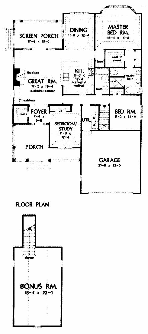 Ranch home with a spacious great room that includes a cathedral ceiling, a fireplace and attractive built-in cabinets on either side. The nearby kitchen includes ample counterspace for preparing meals while leading to the dining room in the back. The master bedroom includes a walk-in closet and a master bath with double vanity, tub and a separate shower. Two more bedrooms at the front share a bath. Second-floor bonus room can serve many functions.