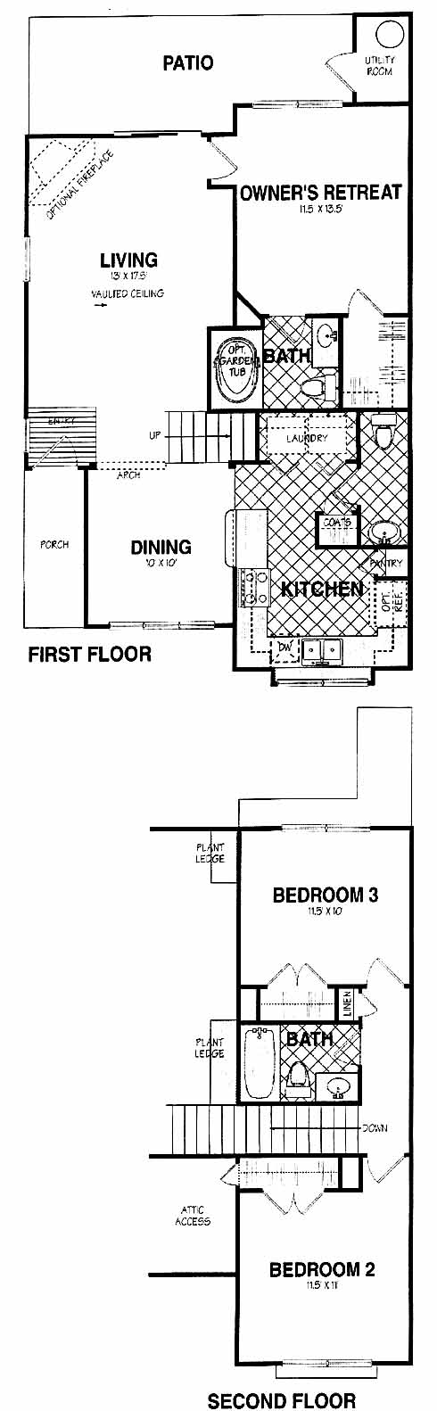 Entry opens to large living area with optional fireplace and vaulted ceiling. Separate dining room and kitchen with laundry and half bath. Owner's Retreat on main floor with master bath and walk-in closet. Upstairs are two large bedrooms that share a full bath.