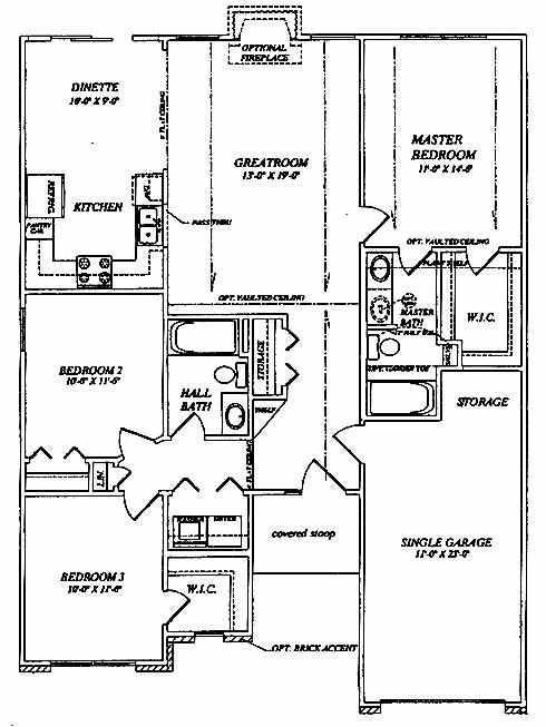 Split plan with a large master bedroom that includes a walk-in closet and private bath. Two bedrooms on the opposite side of the home share a bath and have close access to the laundry area. The great room with optional fireplace is perfect for entertaining guests or just relaxing on the weekend. The dinette leads to the kitchen where you can easily prepare meals.