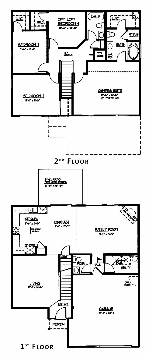 This two-story design includes a large living room at the entry that leads to the rest of the home. The kitchen with pantry and optional island workspace opens into the breakfast room with patio access. Relax comfortably in the large family room with optional fireplace available. The second-floor owner's suite includes a walk-in closet and master bath with soaking tub. Three more bedrooms share a bath and have ample closetspace.