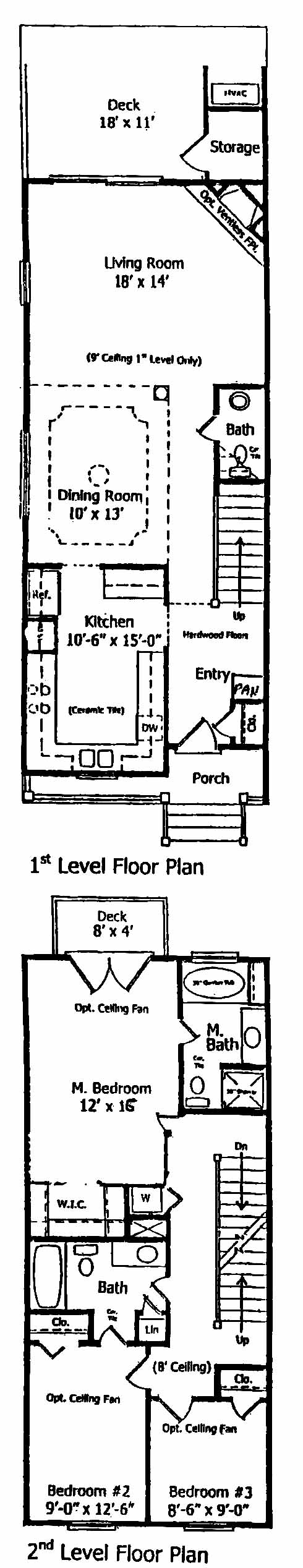 These town homes include many standard features including 9 foot ceilings, ceramic tile in the kitchen and bath rooms, cultured marble vanity tops and a 500 square foot attic storage area. The first floor features a generous kitchen area opening into a formal dining room with a trey ceiling and continuing into a large living area room area with an optional corner fireplace. The 18 x 11 deck area extends off of the living room over the lake and includes an outside storage room. The master bedroom on the second floor features an outside deck area where you can enjoy the view, a walk in closet, and master bath with a garden tub. Two additional bedrooms with a hall bath are also on the second floor. The third floor is a large attic area with an optional dormer design.