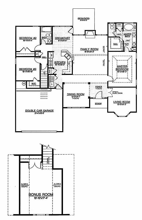 First floor master suite with tray ceiling, split bedroom plan. Formal living and dining rooms. Vaulted family room overlooks the deck. Large bonus room on the second floor can be used as the 4th bedroom.