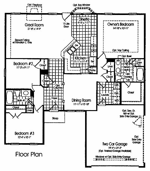 This split-plan includes two bedrooms to one side of the home with a bath between them. The owner's suite on the opposite side of the home includes a walk-in closet and private bath with linen closet. The kitchen, centrally located, includes a pantry and opens into the dinette and dining rooms on either side. The great room is a perfect spot for entertaining guests with its large size and optional fireplace.