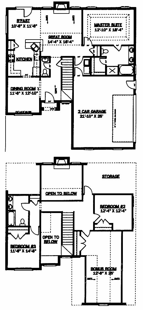 The entry takes you past the dininig room just before you come to the great room with fireplace. To your left you'll find the kitchen with breakfast area. On the other side you have the master suite and bath with dual vanities. Upstiars are 2 spacious bedrooms, hall bath and the bonus room.