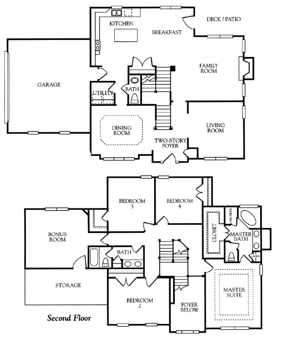 This is a traditional floor plan with a two-story foyer, split staircase, large kitchen with island, bonus room and lots of storage.