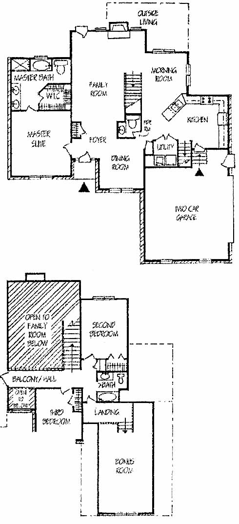Two-story home with large dining and family rooms at the foyer entrance. The morning room leads to the kitchen with ample counter space for preparing meals. The first-floor master suite has a walk-in closet and master bath with double vanity, tub and separate shower. The second floor has two more bedrooms, a shared bath and a bonus room.