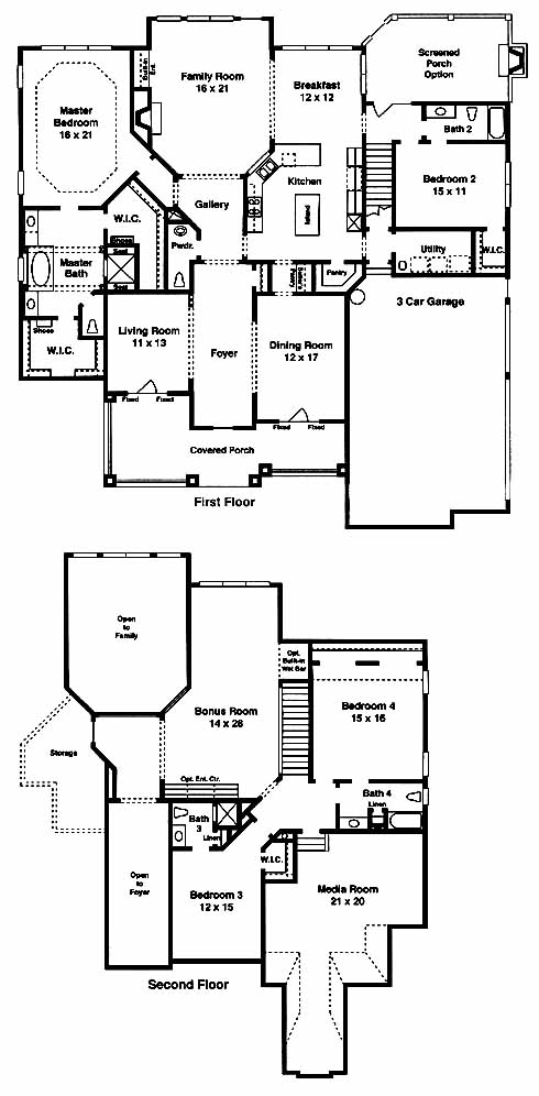 This home features a large first-floor master bedroom with oversized his and her walk-in closets and a master bath with dual vanities, tub and separate shower. A second bedroom is located on the opposite side of the home and has private access to a bath. The spacious kitchen with walk-in pantry and island workspace makes preparing meals a breeze. The breakfast room leads to the family room with fireplace and built-in entertainment center. Formal living and dining rooms are at the front. The second floor has two more bedrooms, two baths, a bonus room and a media room perfect for movie night.